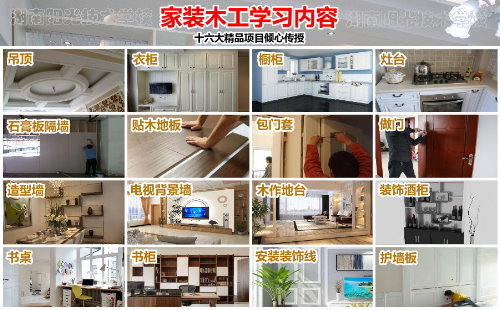 3,重点学习:吊顶、衣柜、橱柜、灶台、石膏板隔墙、贴木地板、**门头、**门套(**括做门)、窗帘盒制作安装、造型墙、电视装饰背景制作、木作地台、装饰酒柜、书桌、书柜、安装木质装饰线、护墙板等十六种家装木工技术。木工防火安全知识、木工职业健康知识。
